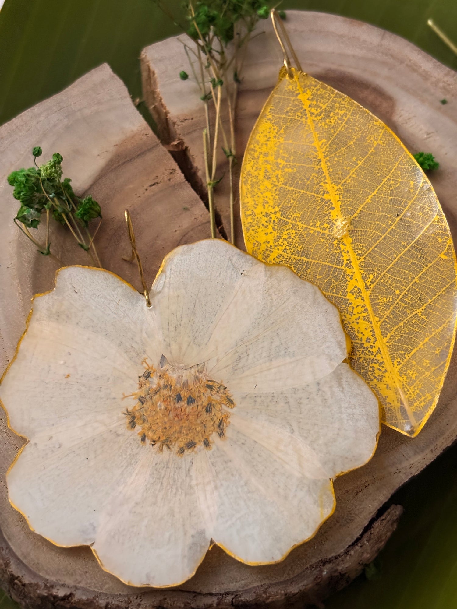 Modelo de pantallas asimétricas, Flor cosmo real y hoja esqueletizada, ambas encapsuladas