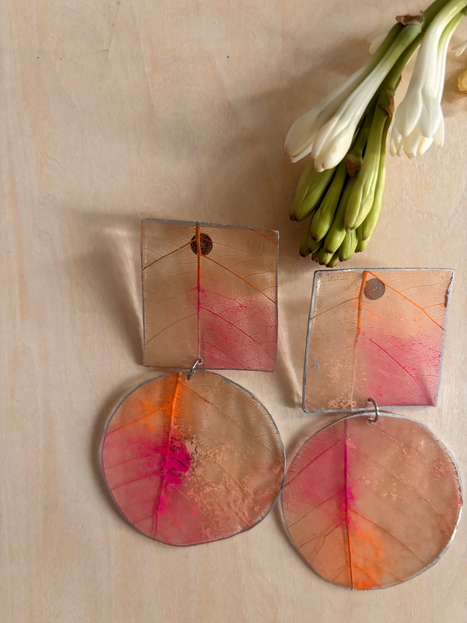 Par de pantallas de figuras geometricas hechas con hojas y pintadas a mano.