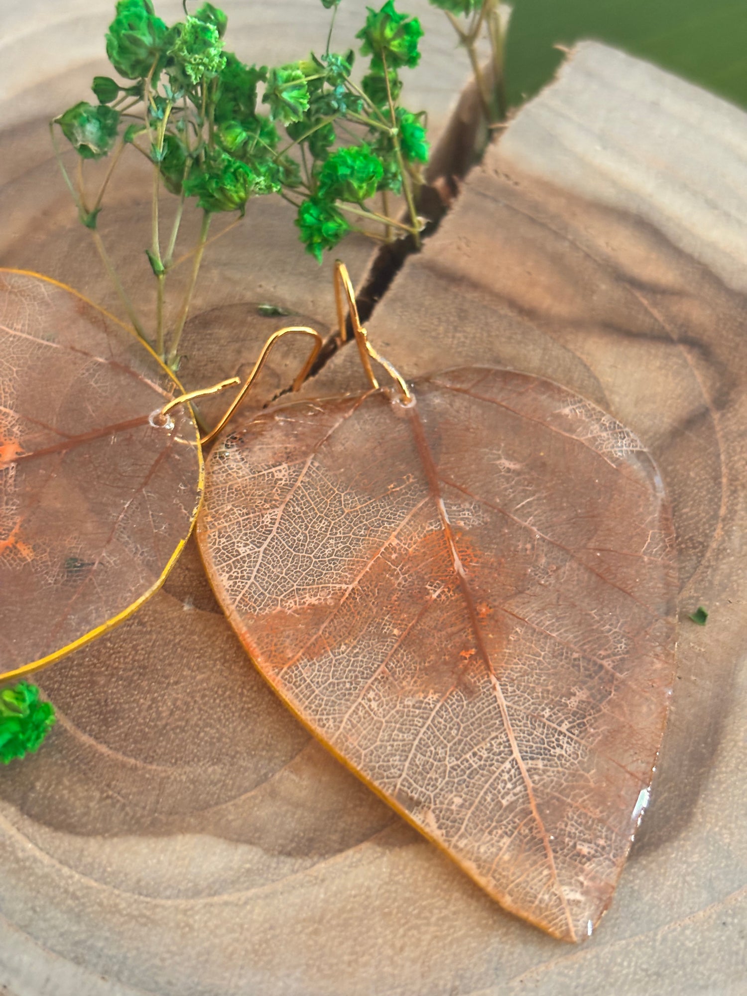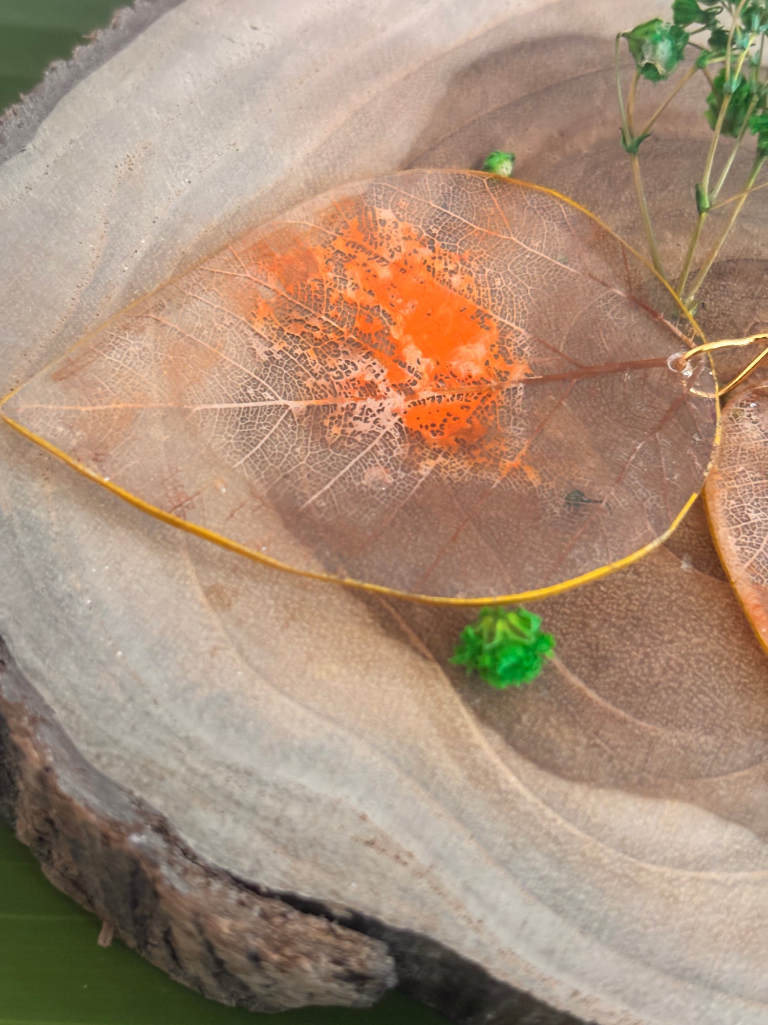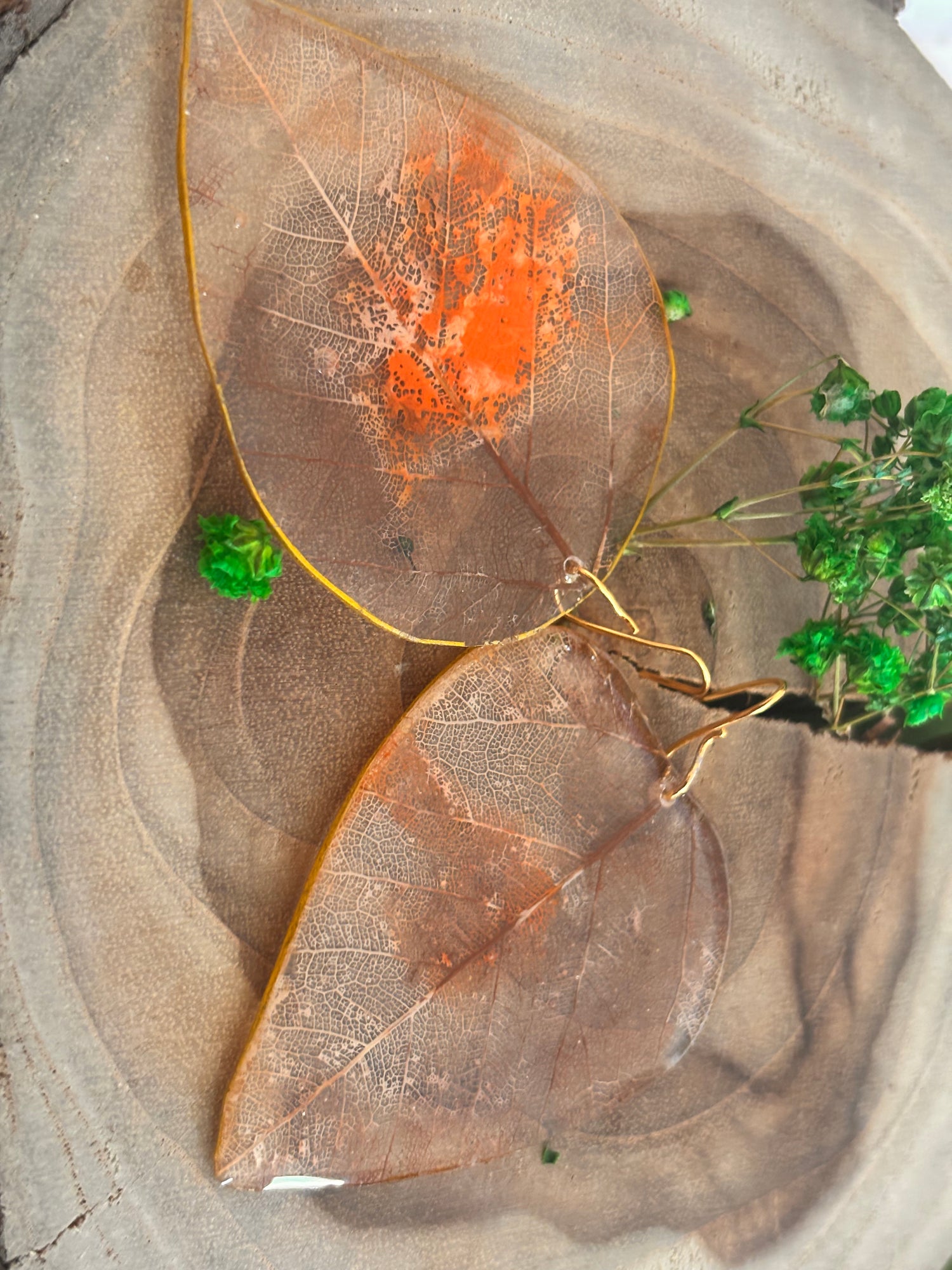 Esqueletos de hojas convertidas en pantallas. Pintadas a mano y revestidas. Miden alrededor de 1.5”