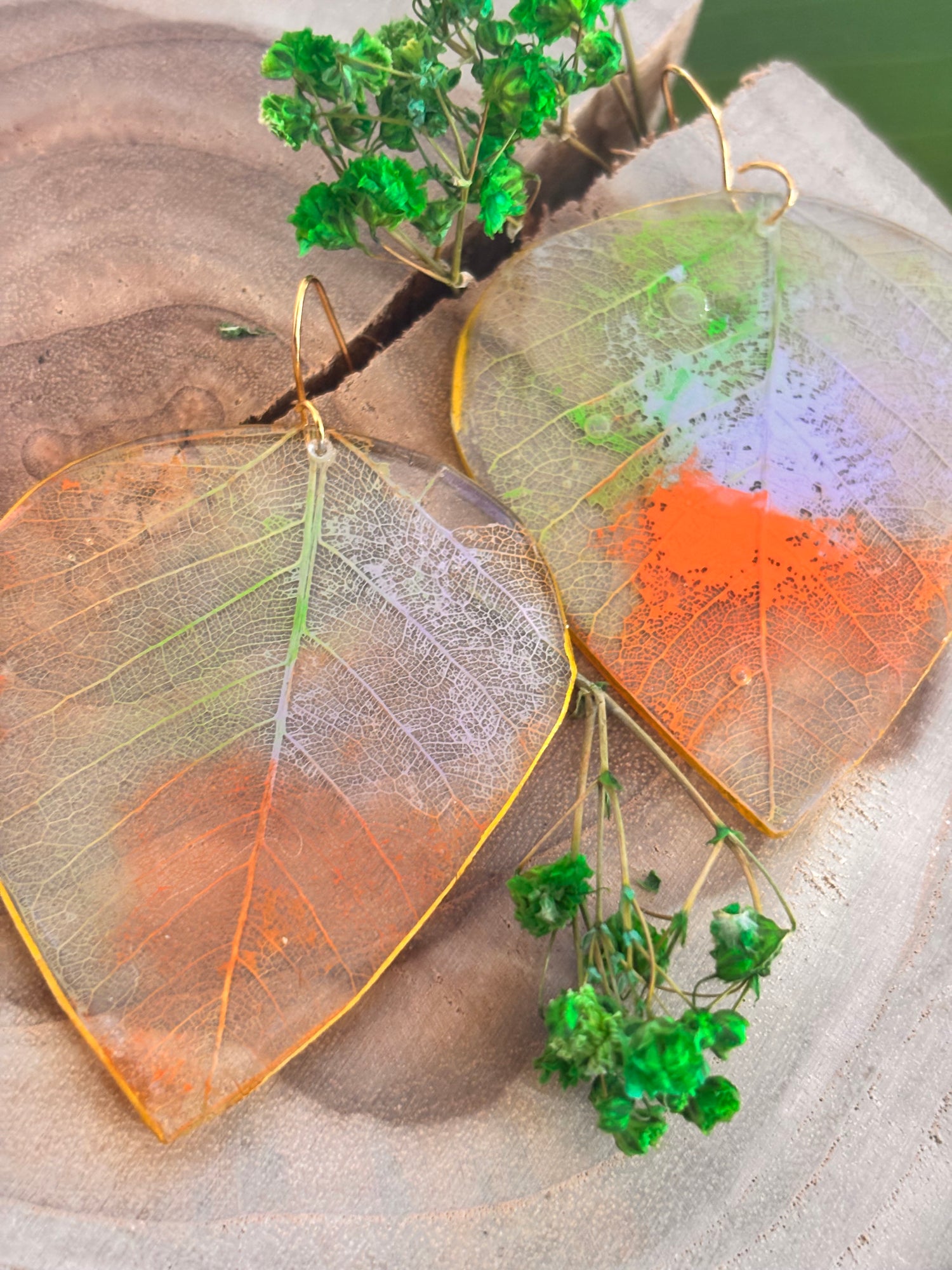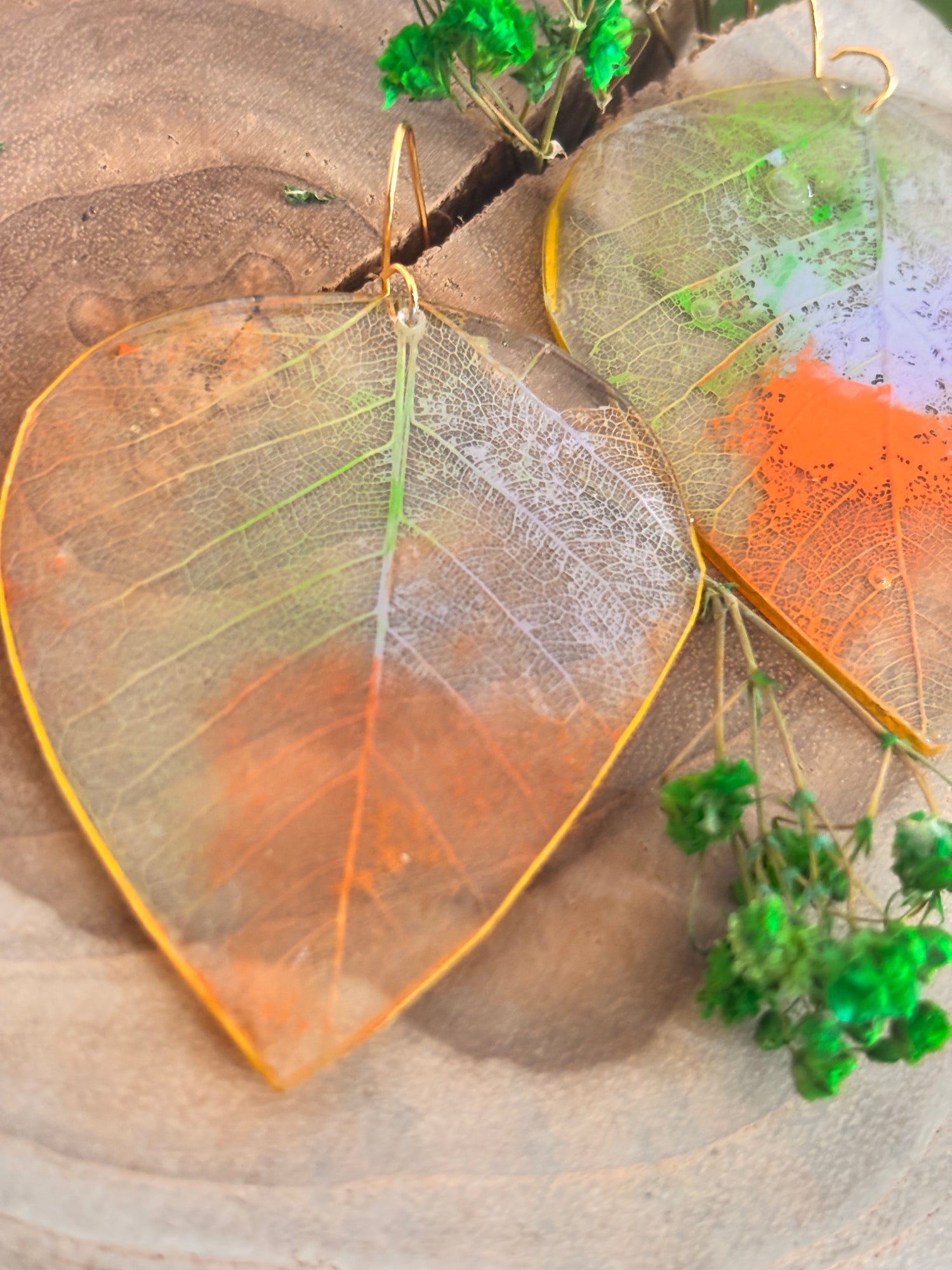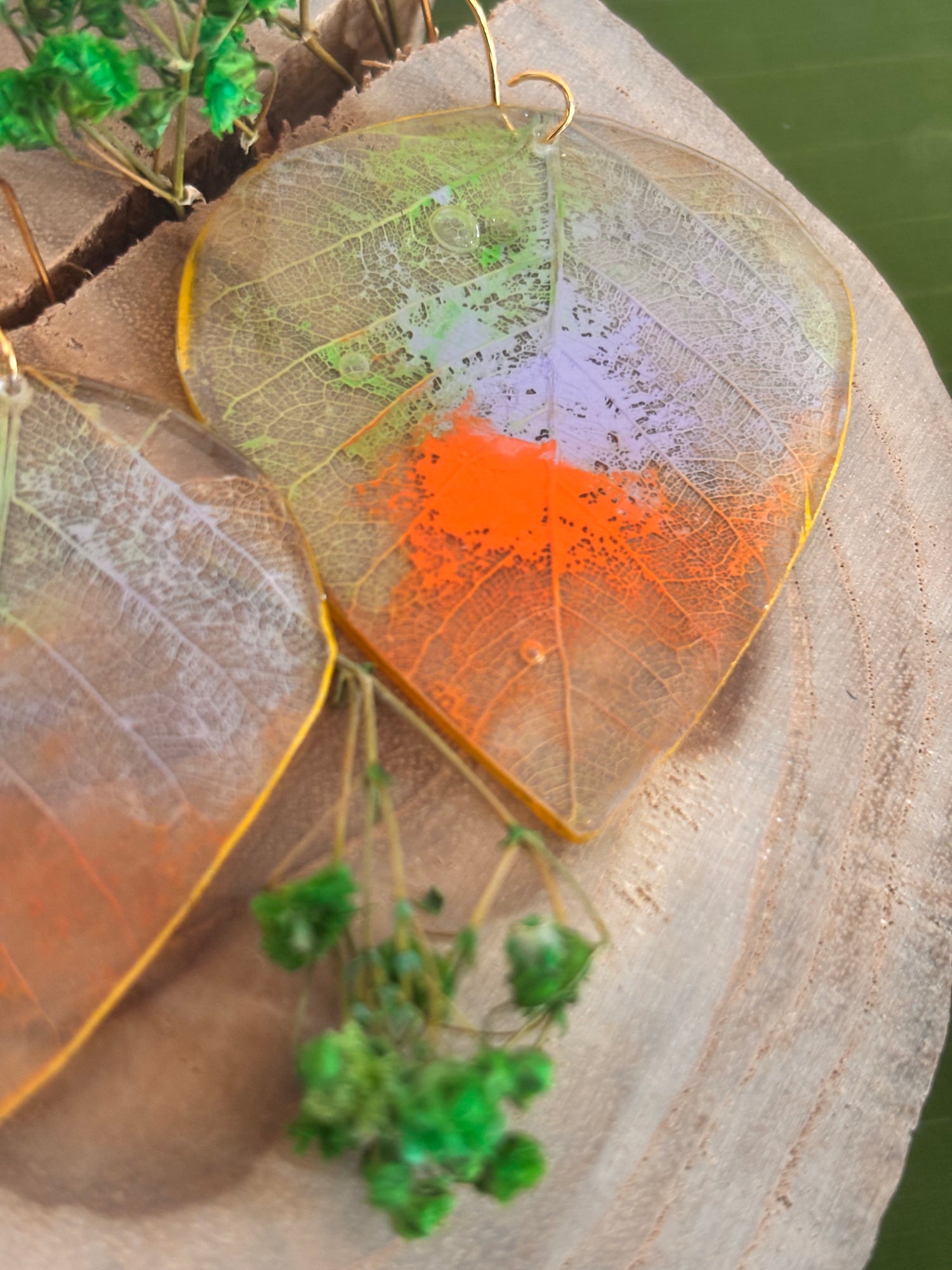 Pantallas de hojas en esqueleto, pintadas a mano y revestidas. Miden alrededor de 1.5”
